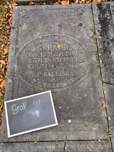 Tot aandenken aan Gerard geb. 19 maart 1891 overl. 18 mei 1893 Geliefd zoontje van J.P. Dallinga & P.G. Toxopeus